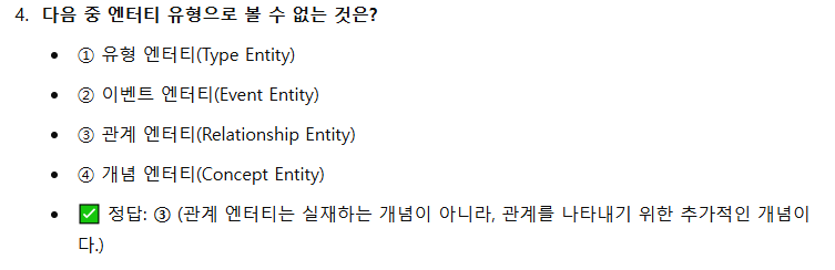 - 개념 엔터티(Concept Entity) : 개념적인 요소(예 : 학과, 직급)