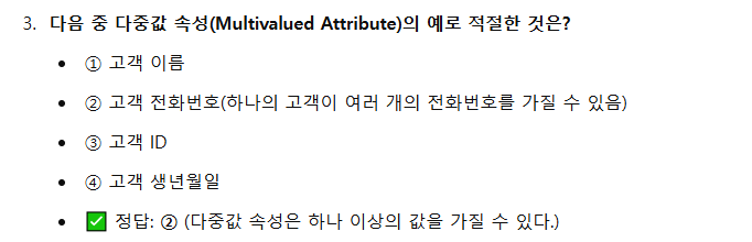 - 다중값 속성(Multivalued Attribute) : 하나 이상의 값을 가질 수 있는 속성으로 한 고객이 여러 개의 이메일을 가질 수 있는 경우가 해당된다.