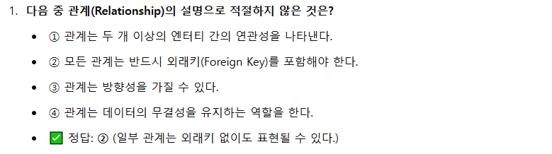 관계(Relationship)는 데이터 모델에서 필수적인 개념으로 엔터티 간의 연관성을 정의하고 데이터의 무결성을 유지하는 역할을 한다. 관계의 유형(1:1, 1:N, N:M)과 외래키의 역할을 명확히 이해하고 적절한 무결성 제약 조건을 설정하는 것이 중요하다. SQLD 시험에서는 관계의 개념뿐만 아니라 무결성 제약 조건과 관계 구현 방식이 중요한 출제 범위이므로 철저한 이해가 필요하다.