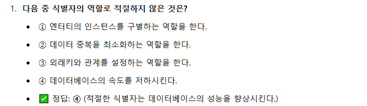 식별자(Identifier)는 데이터베이스에서 엔터티(Entity)의 개별 인스턴스를 유일하게 구별할 수 있도록 하는 속성을 의미한다. 식별자를 설정하면 동일한 데이터를 중복 없이 관리할 수 있으며 엔터티 간 관계를 명확히 정의할 수 있다. SQLD 시험에서는 식별자의 개념, 유형, 선정 기준 등을 정확히 이해하는 것이 중요하다.