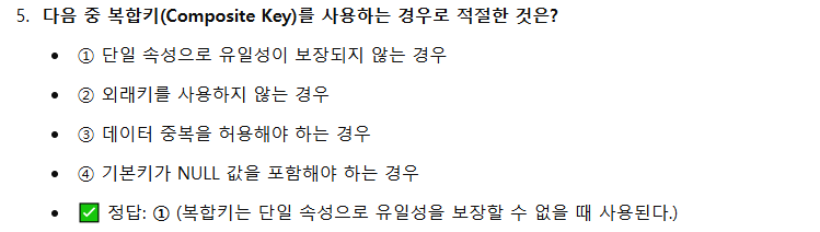- 복합키(Composite Key) : 두 개 이상의 속성을 조합하여 기본키를 구성하는 방식이다.