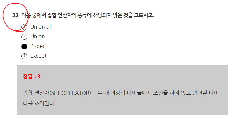| EXCEPT | 집합 연산자 | 차집합 | 첫 번째 결과에만 존재하는 데이터 |