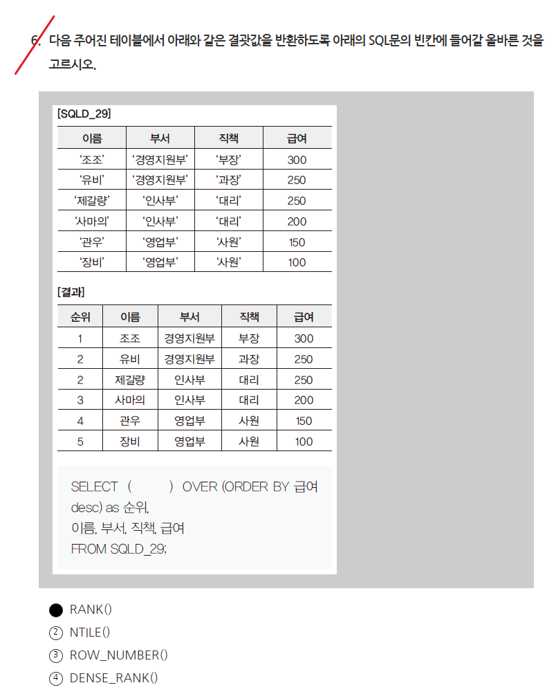 | RANK() | 중복된 개수만큼 등수를 건너뜀 | 1, 2, 2, 4, 5 |
